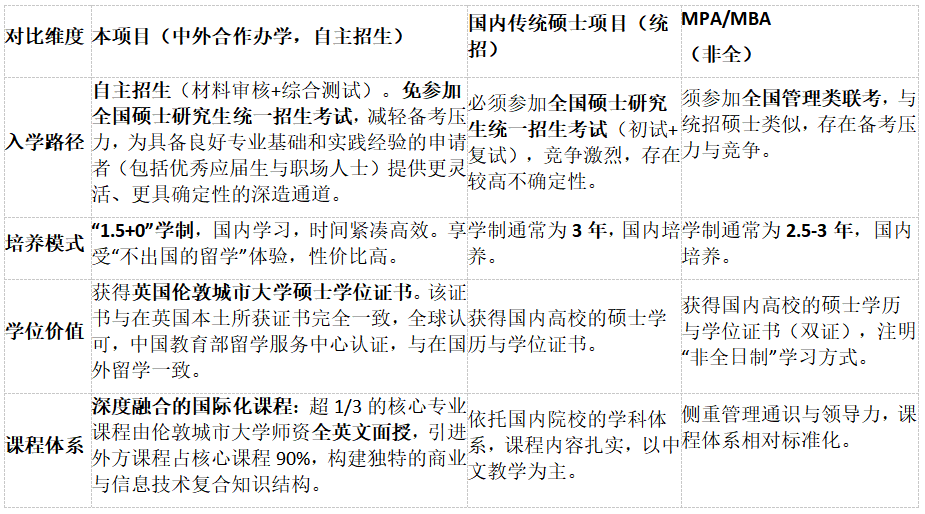 相较于报考国内院校的传统硕士路径,本项目为学生提供了差异化选择,核心优势如下: