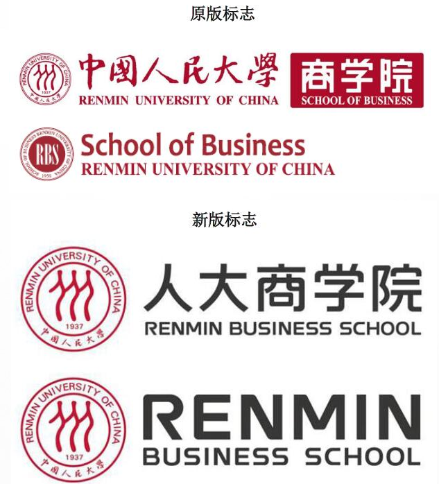 新标志清晰明朗,设计更为简洁,容易识别,便于记忆,符合互联网背景下新的设计潮流以及国际一流商学院标志的变化趋势。其中,图形部分基本保留中国人民大学标志图形,使得学校母品牌形象和核心元素得以传承;中文字体部分在篆书的基础上,进行了现代设计感的规整,使整个标志字体既有篆书的古韵,又有现代字体的气质;英文标志采用“RENMIN”拼写,在国际环境下具有更高的认知度和识别度,更加有利于品牌形象传播,提高品牌影响力。